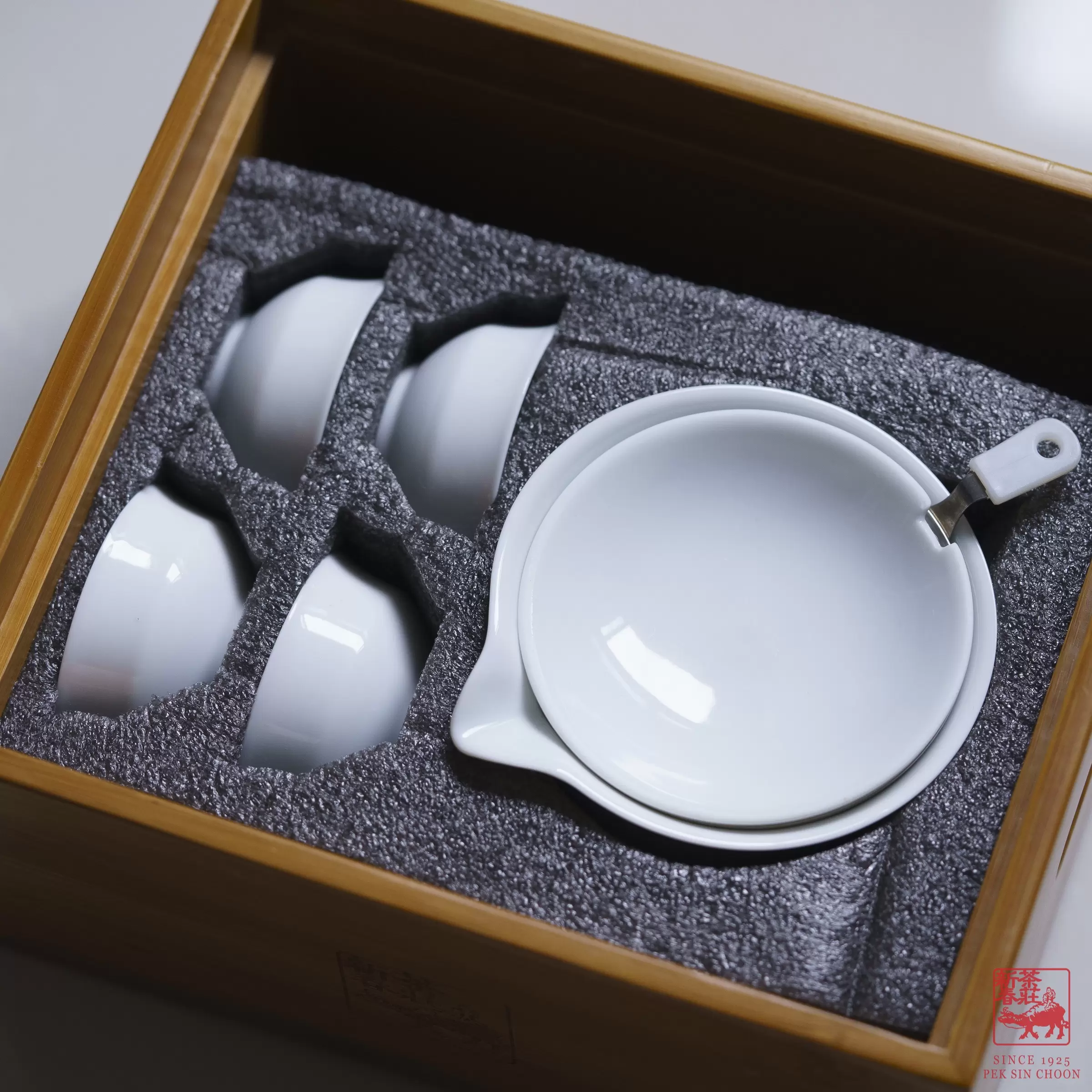 A neat bamboo tea box with a porcelain gaiwan, strainer and four cups. Perfect for your everyday brew!
