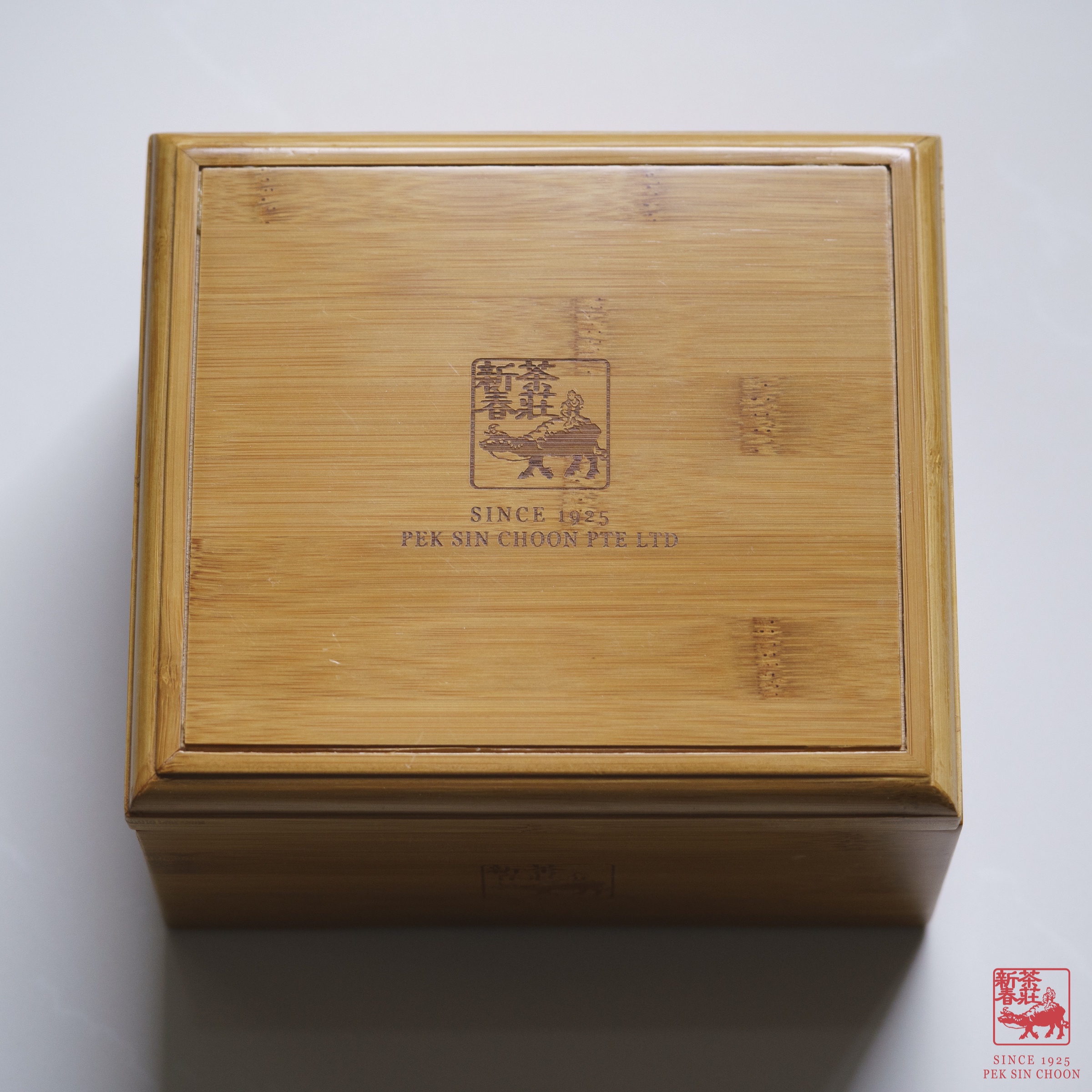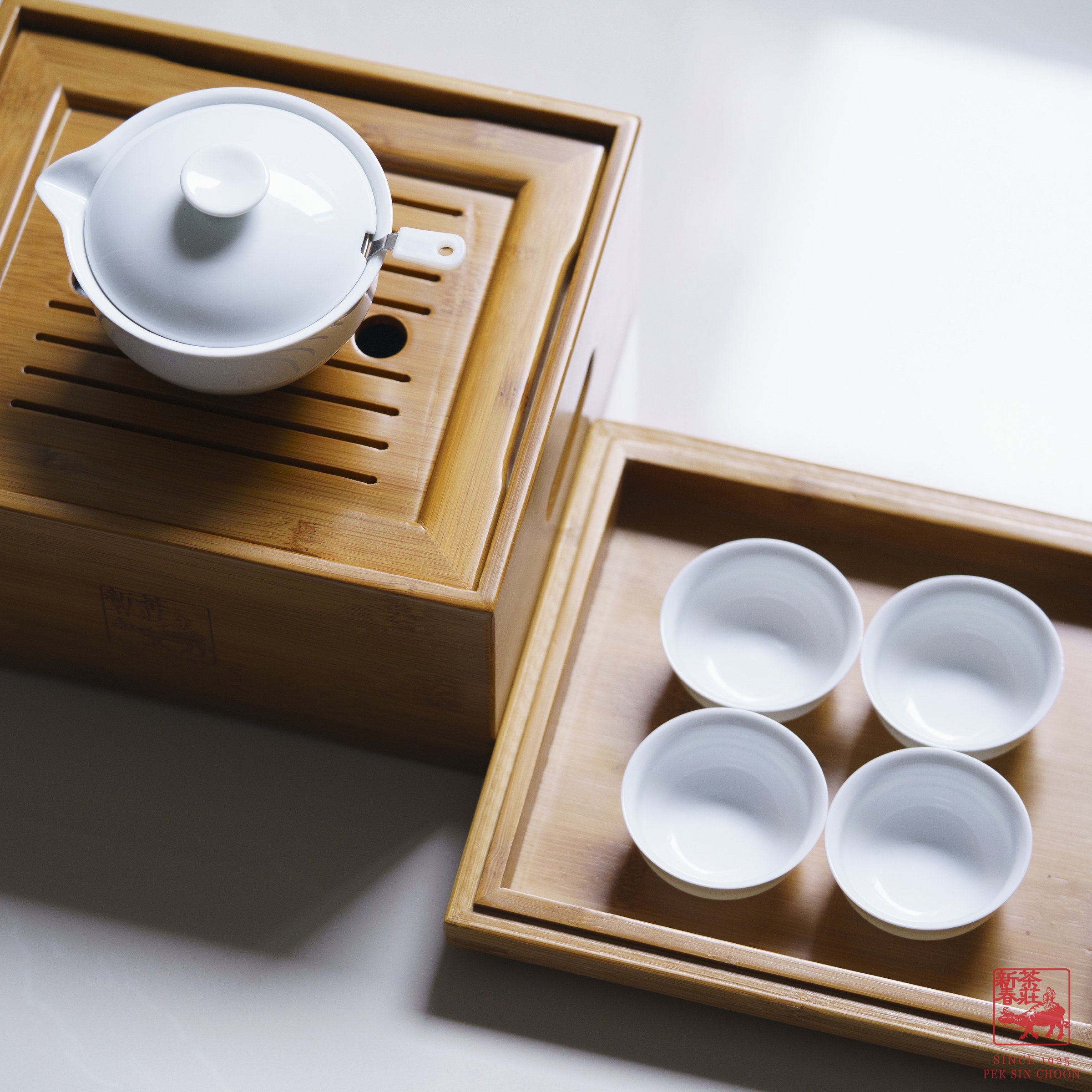 A neat bamboo tea box with a porcelain gaiwan, strainer and four cups. Perfect for your everyday brew!